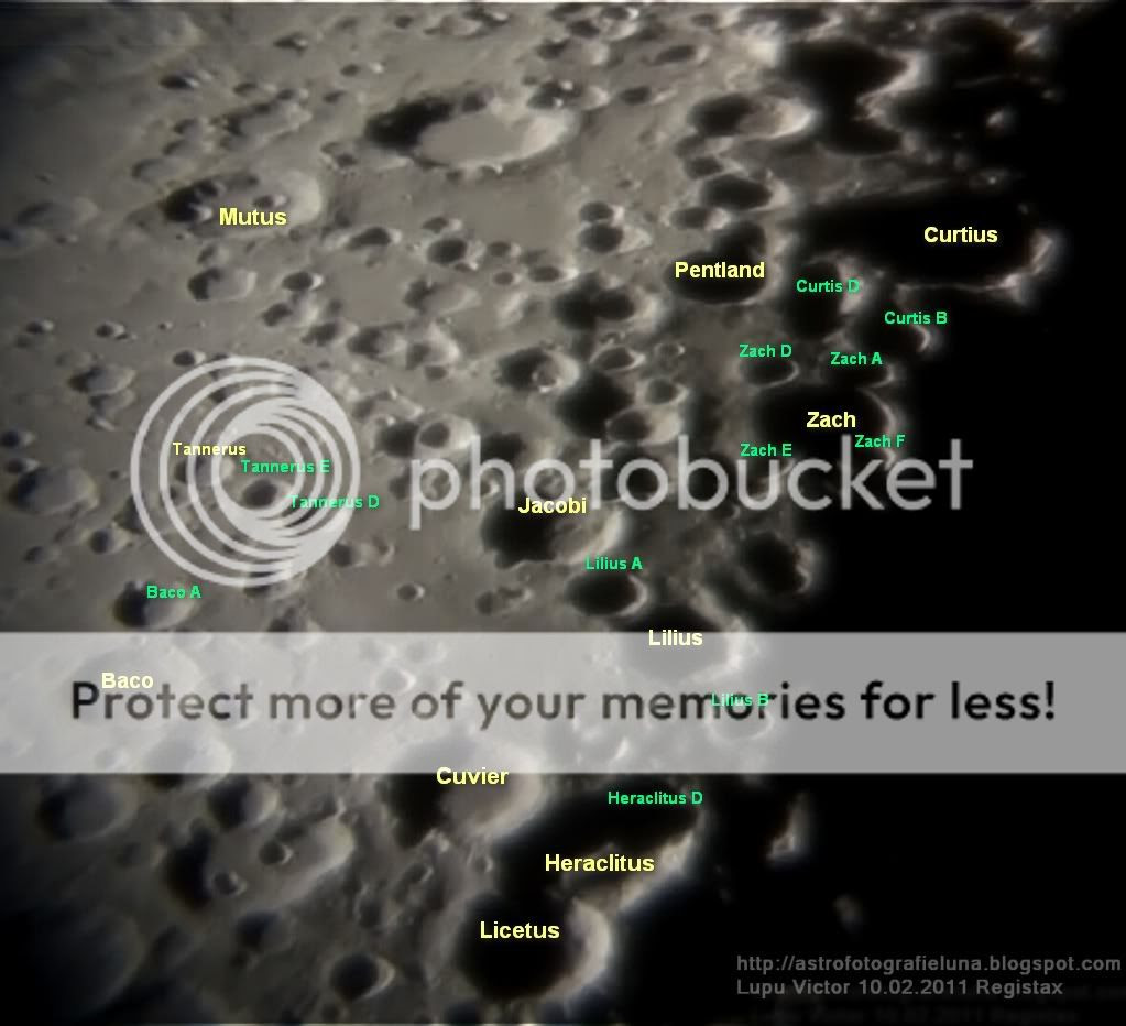 În imaginea de mai jos sunt etichetate craterele şi alte caracteristici de pe Lună din regiunea respectivă. Pentru a înţelege cât mai bine această hartă fotografică, trebuie să reţineţi că eticheta cu numele sau litera craterelor mai mari, ar putea fi găsite în centrul acestora, iar la craterele mici, eticheta se găsește în jurul lor, de obicei deasupra.